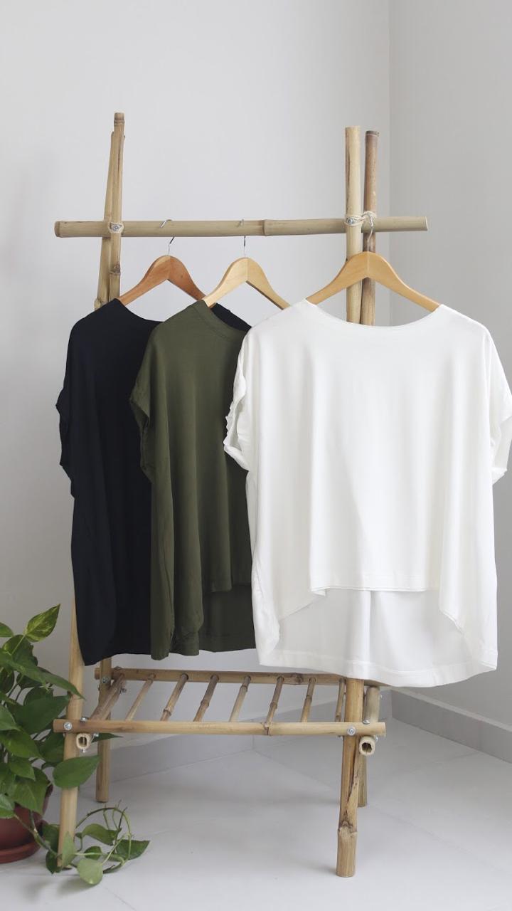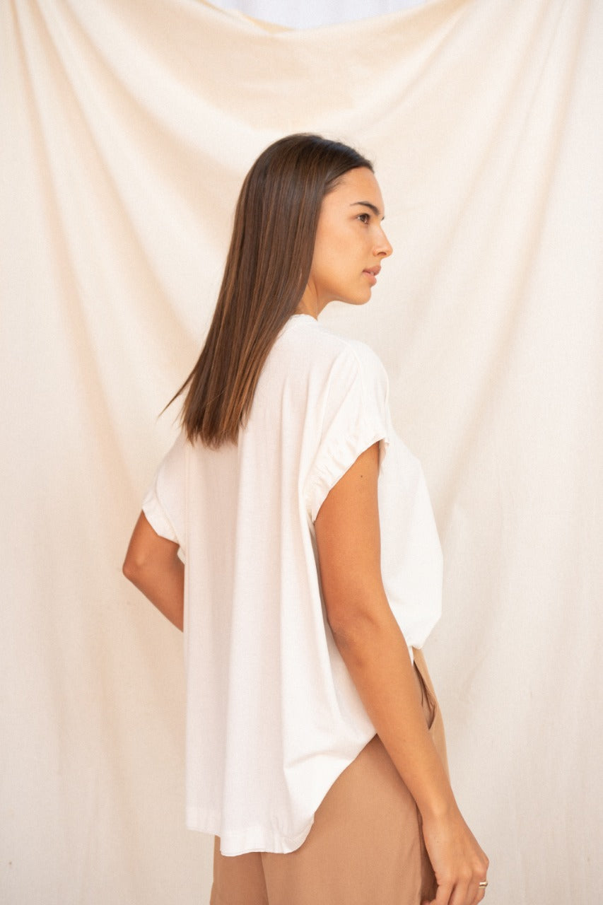 A Bata Quadrada possui uma modelagem bem ampla e versátil. É confeccionada em malha de viscose com elastano, tem aplicação de viés aberto na gola, mangas e barra. A face das costas é mais comprida que a frente.