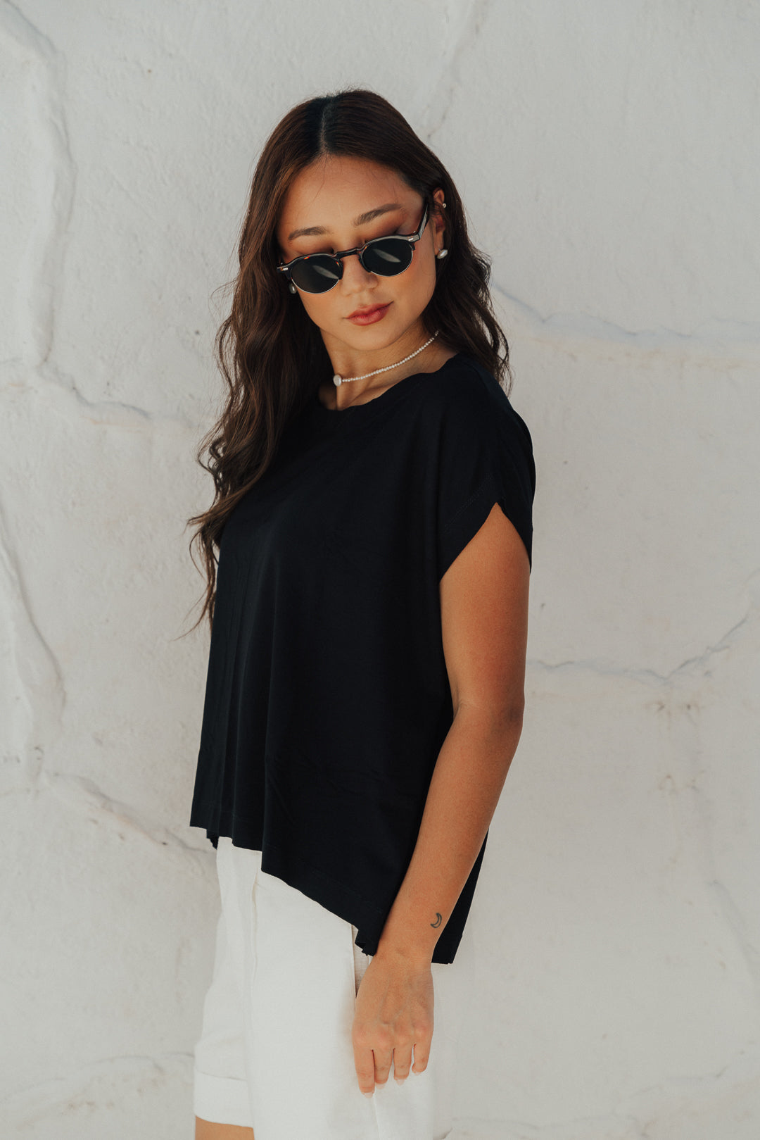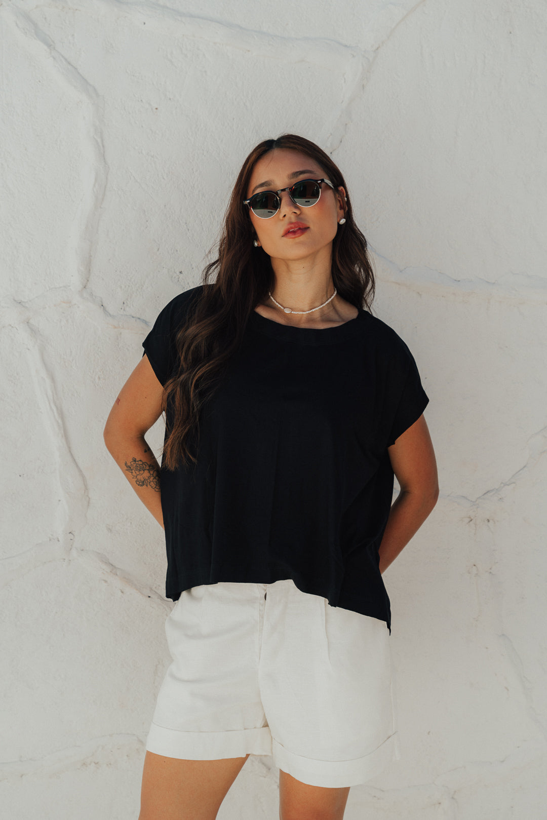 A Bata Quadrada possui uma modelagem bem ampla e versátil. É confeccionada em malha de viscose com elastano, tem aplicação de viés aberto na gola, mangas e barra. A face das costas é mais comprida que a frente.