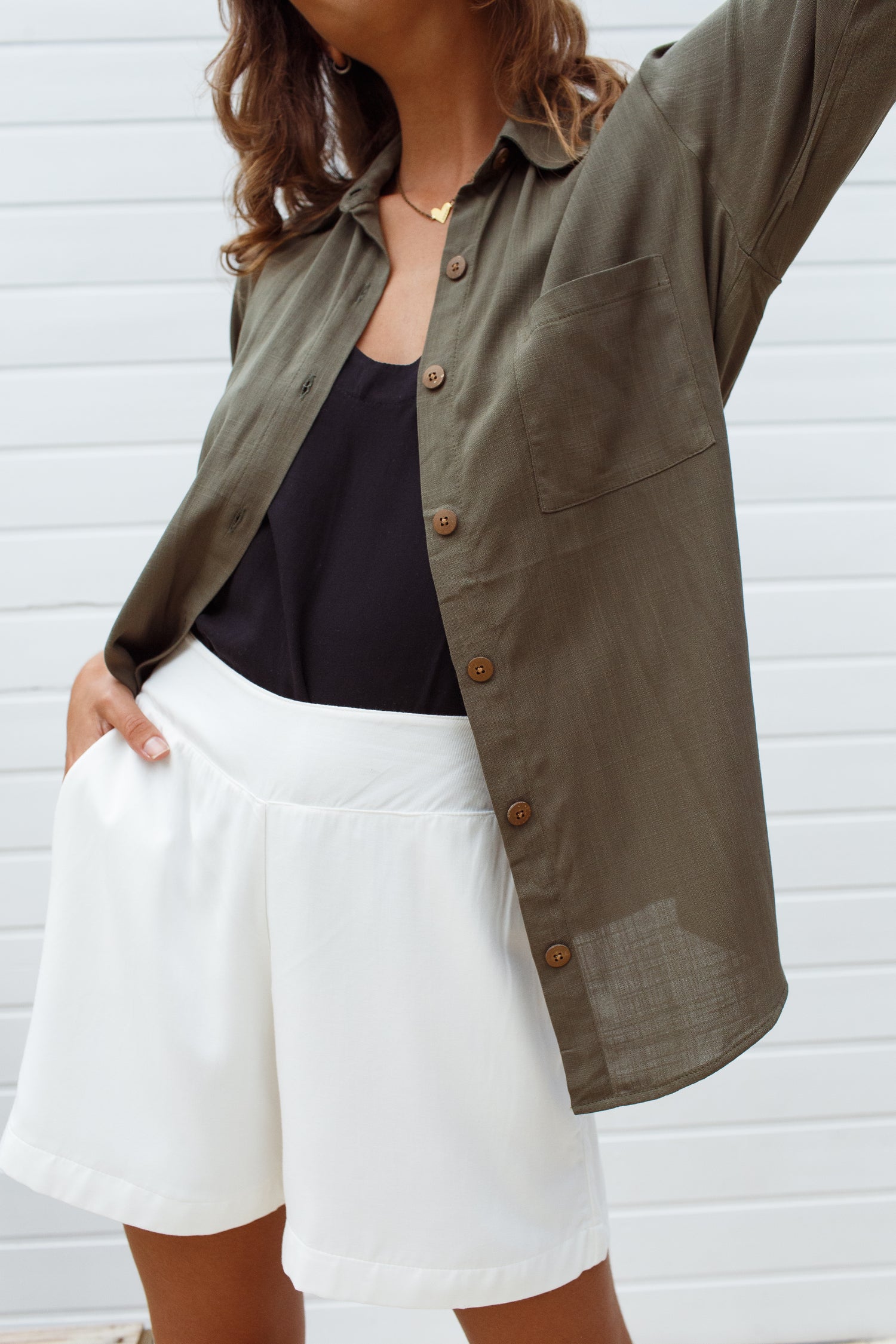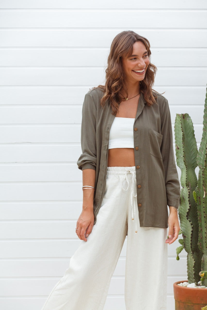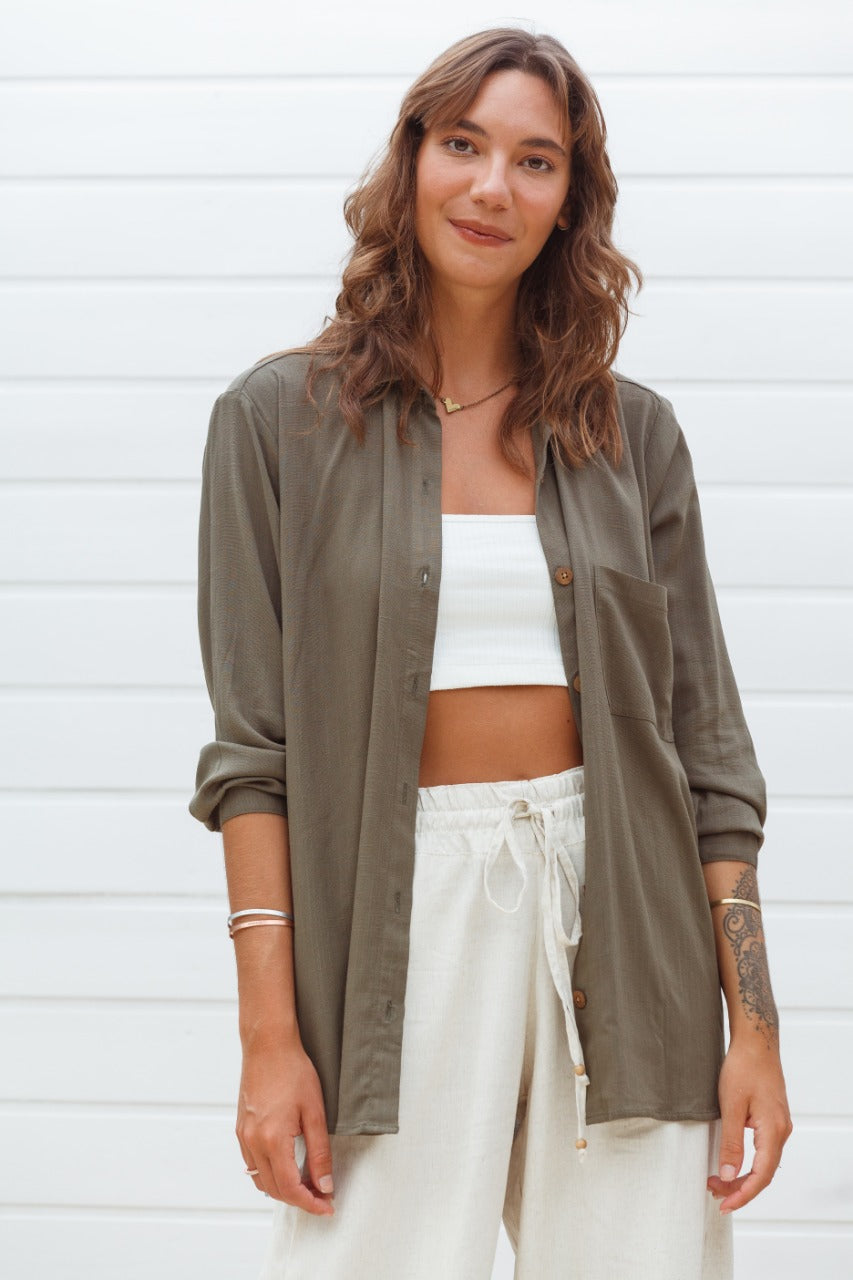 A Camisa Botão é uma peça versátil e atemporal, perfeita para todas as ocasiões! Peça confeccionada em viscose. Possui gola dobrada, abertura frontal com botões de coco caseados. O modelo tem corte reto, manga longa, bolso frontal e dois botões caseados nos punhos.
