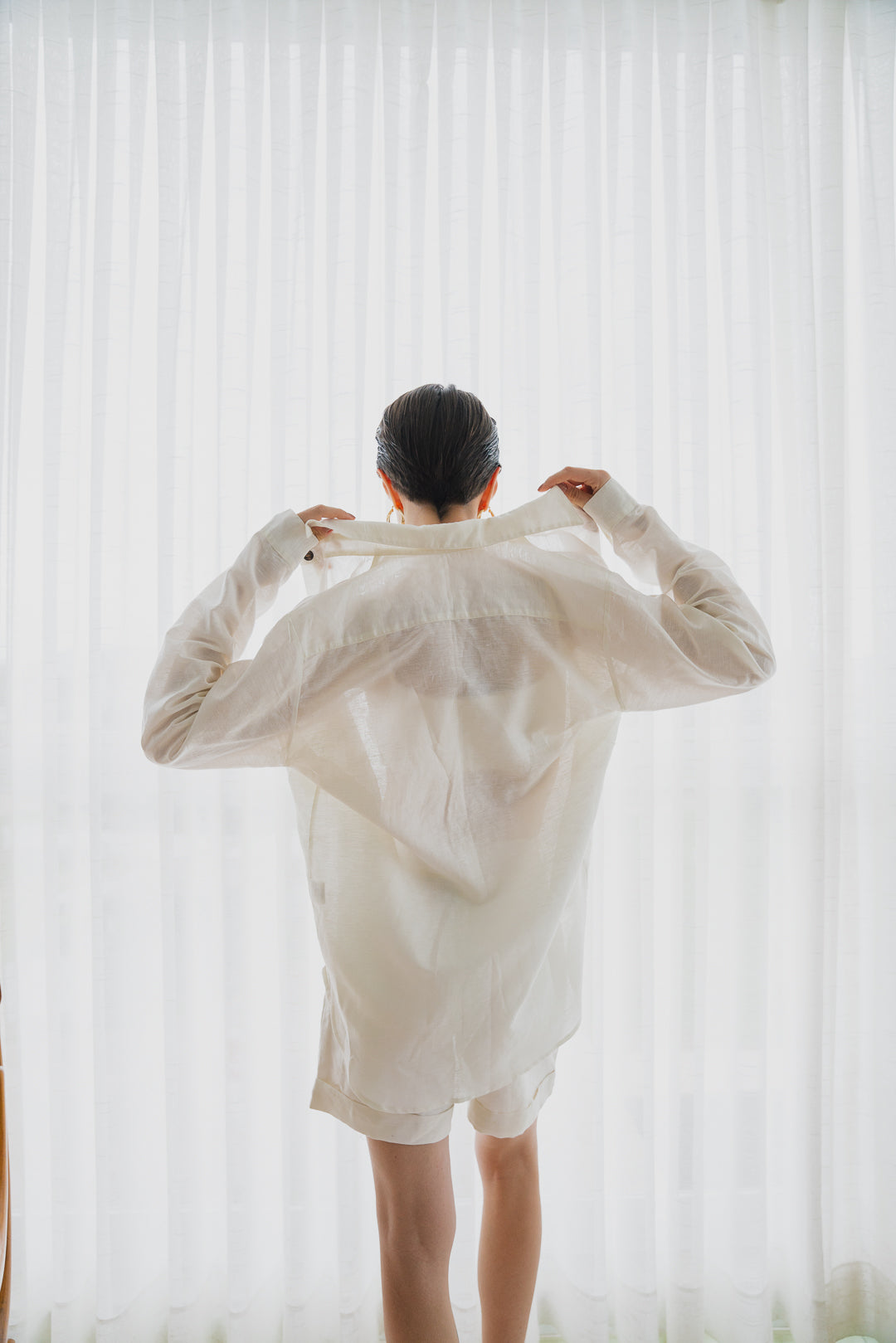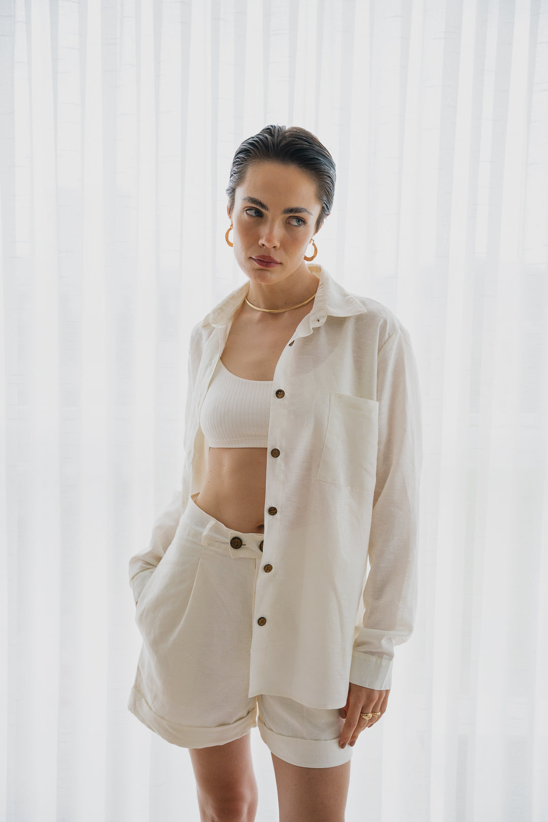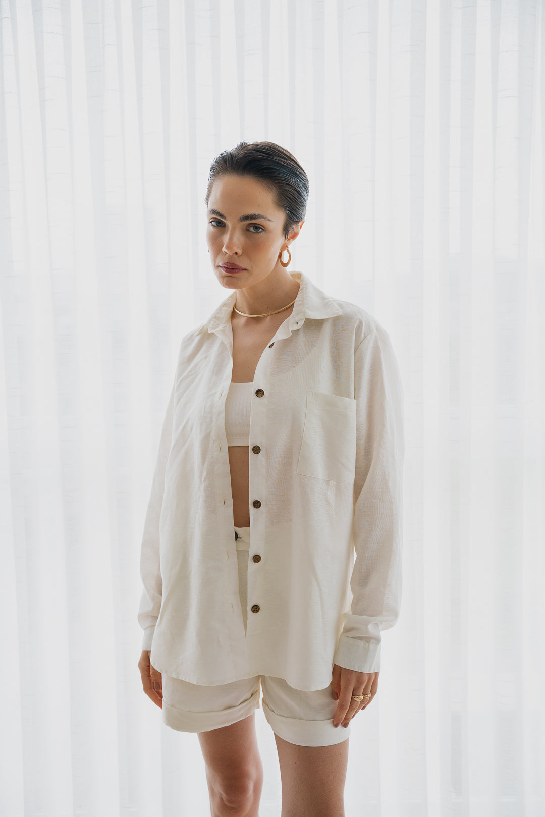 A Camisa de Linho é uma peça coringa e atemporal, perfeita para todas as ocasiões! Peça confeccionada em uma base de linho com algodão. Possui gola dobrada, abertura frontal com botões de coco caseados. O modelo é de manga longa, tem corte reto na base, finalizando com um arredondado nas laterais. Possui bolso frontal e fendas para trazer caimento e fluidez. Pode fazer conjunto com o Shorts Botão. Também pode ser usado como terceira peça, criando looks despojados e versáteis.