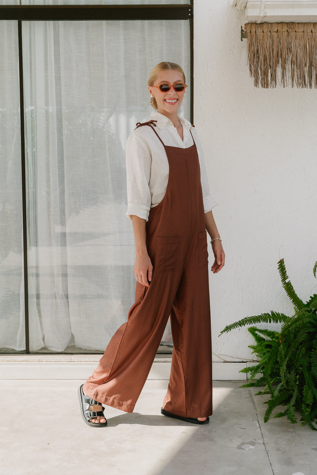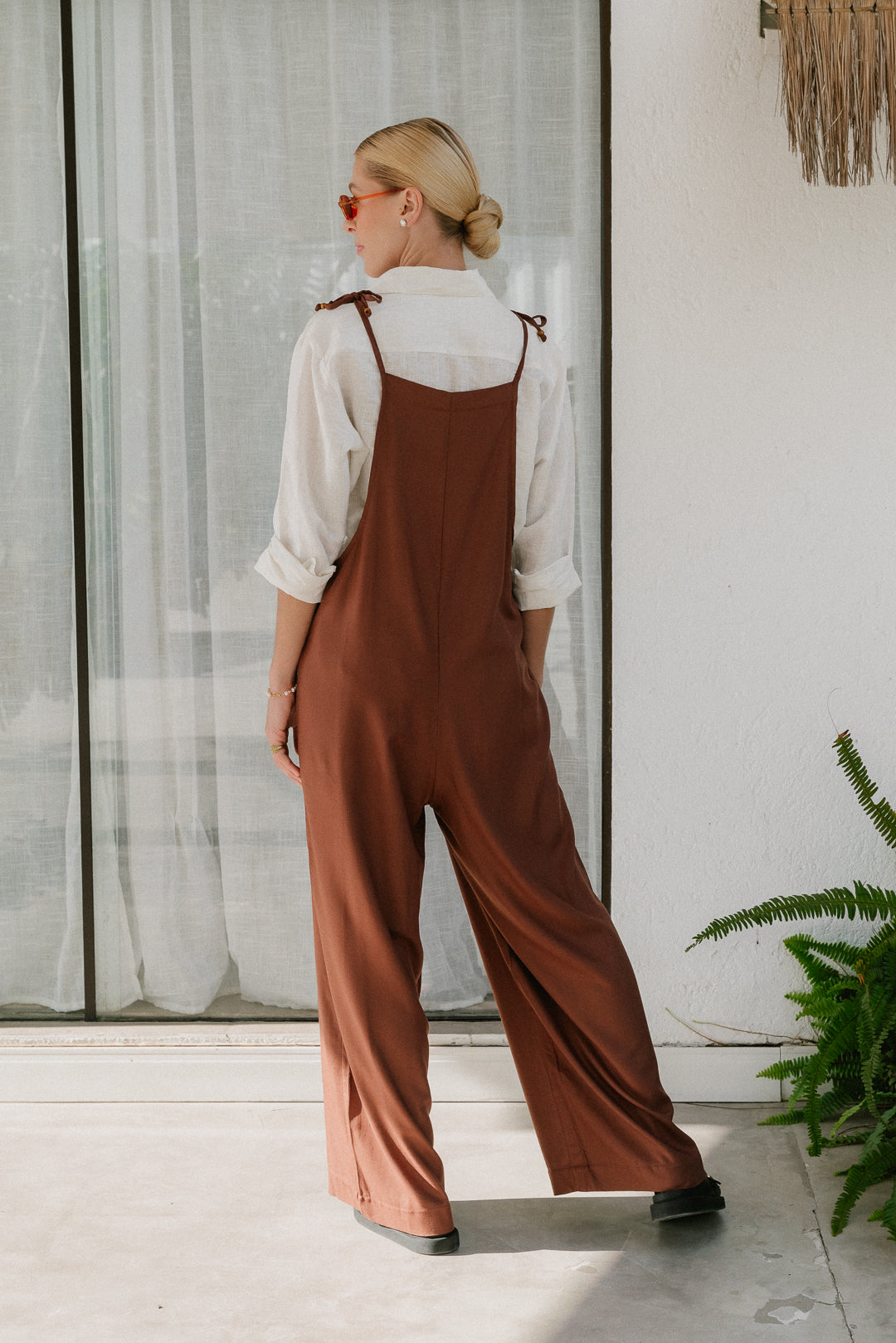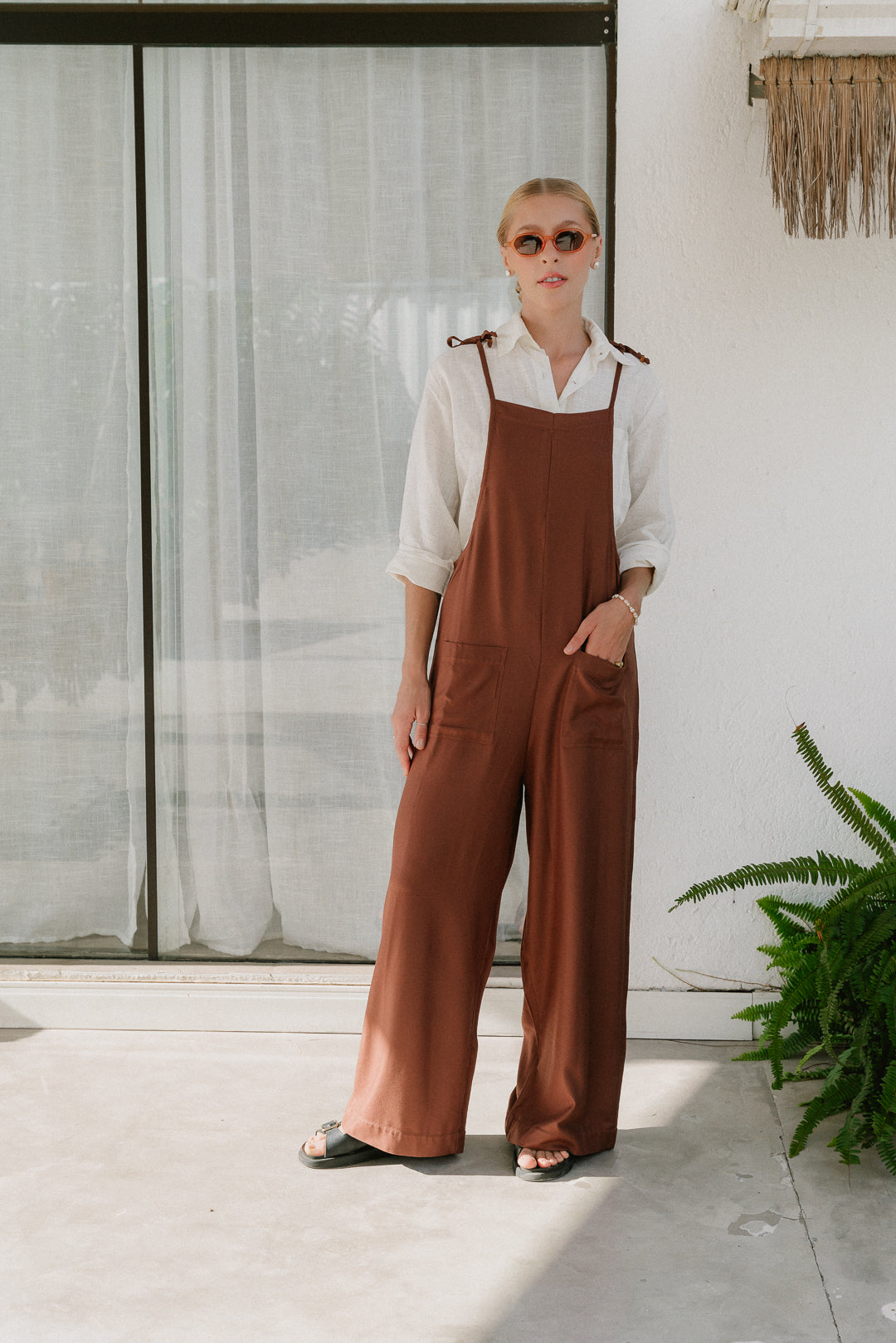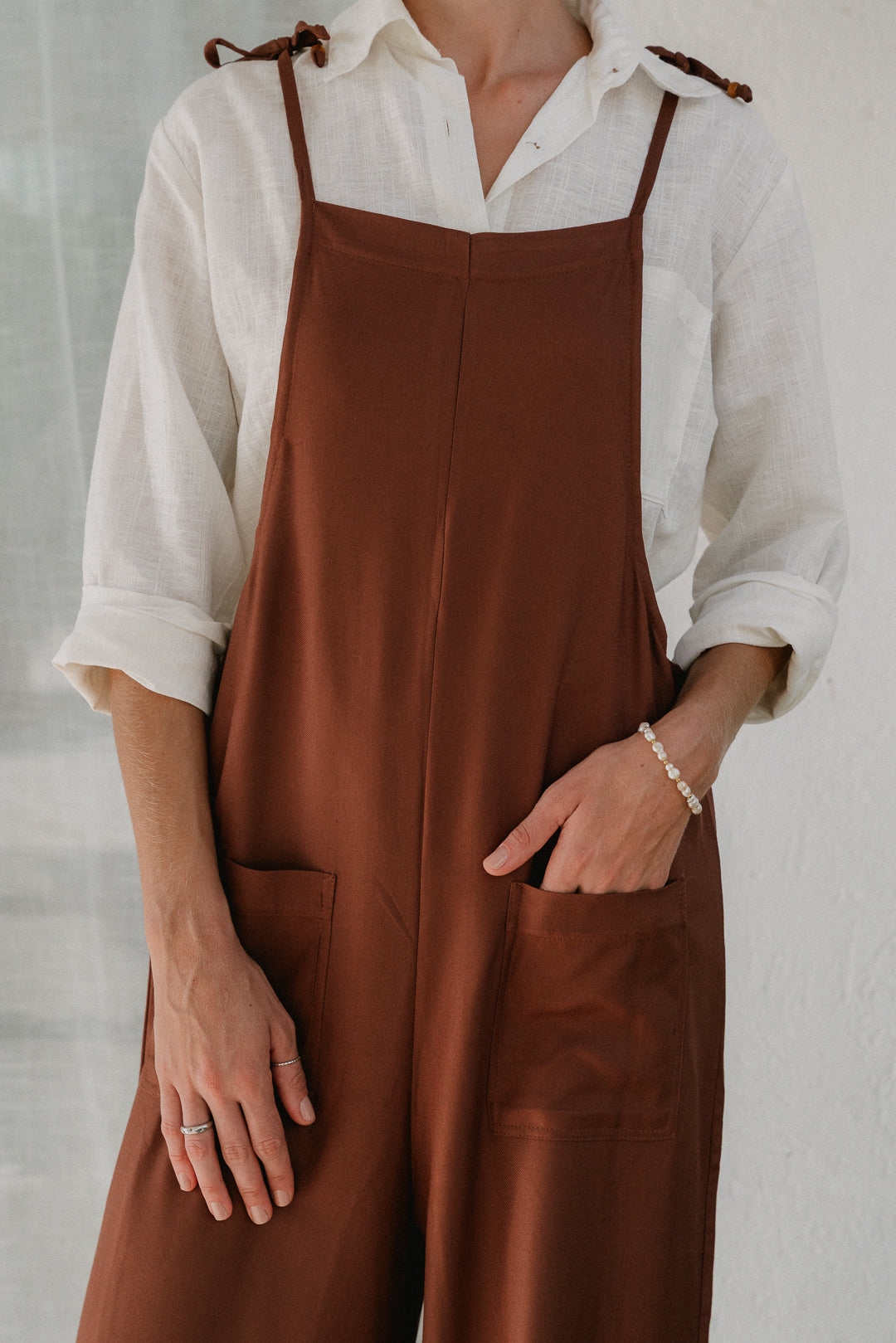 Jardineira Longa com bolsos frontais e alças de amarrar. Disponível nos tamanhos PP, P, M, G e GG.