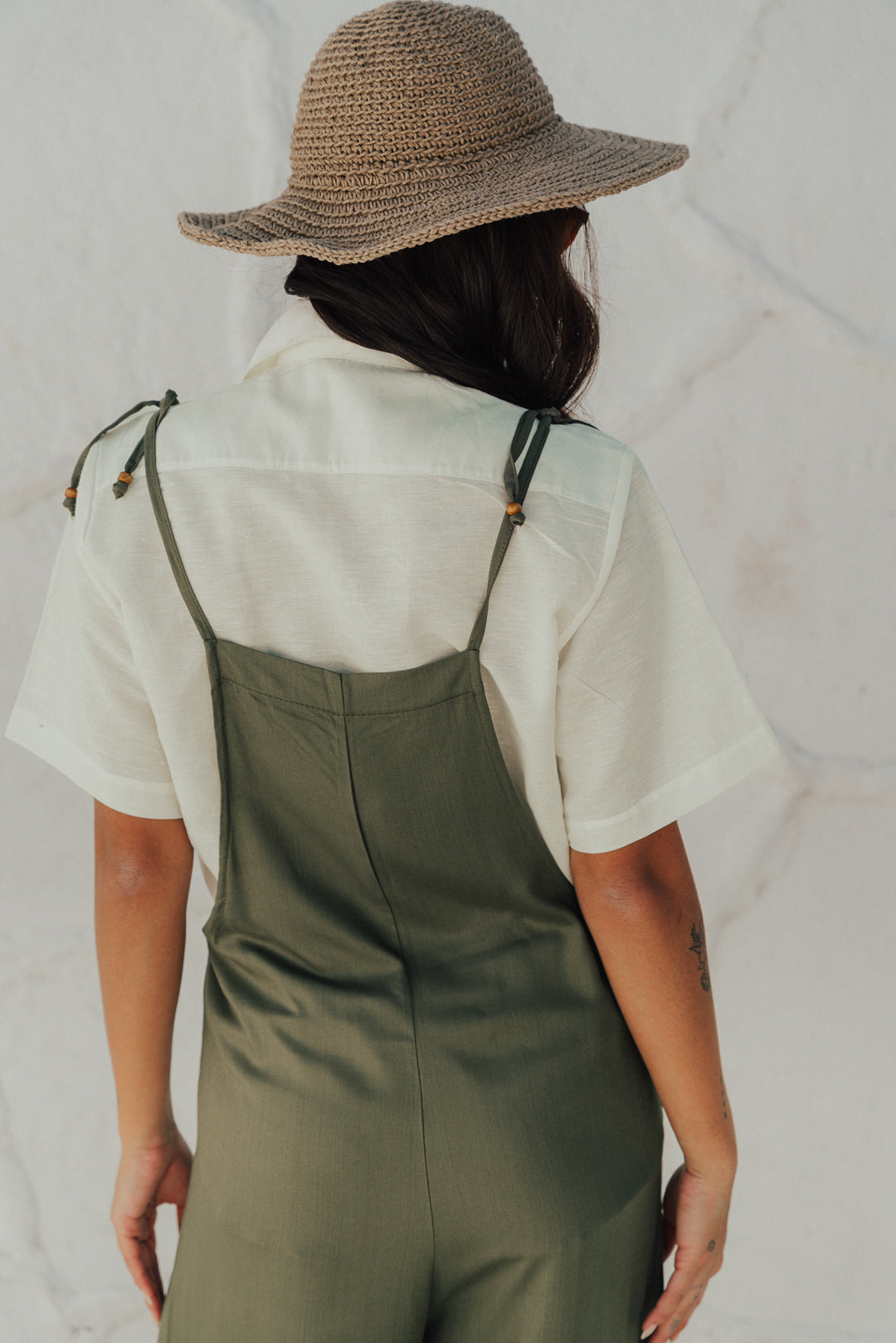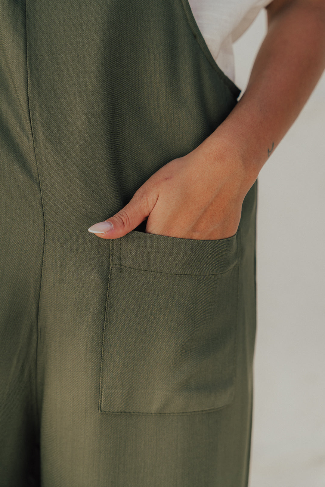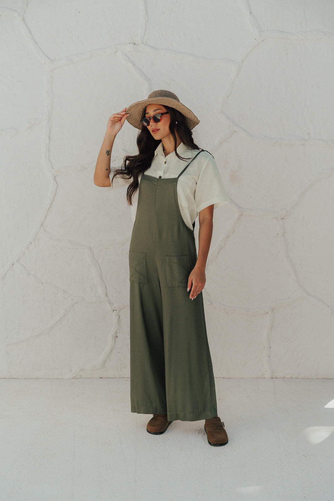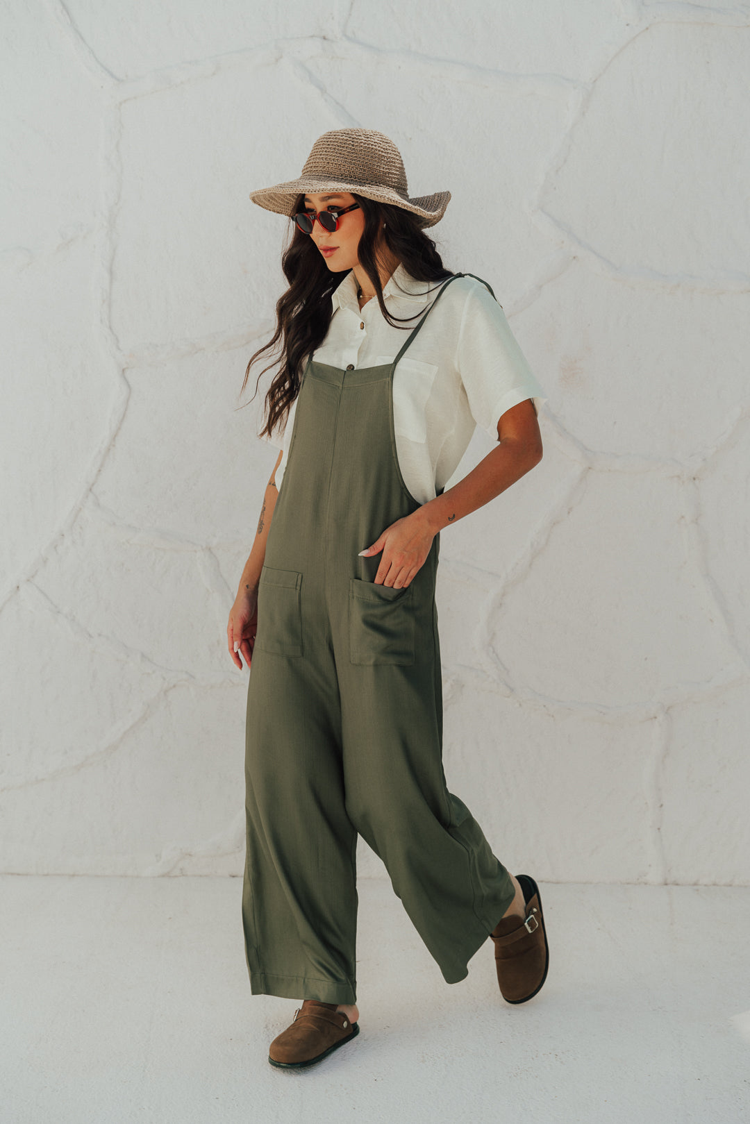 Jardineira Longa com bolsos frontais e alças de amarrar. Disponível nos tamanhos PP, P, M, G e GG.