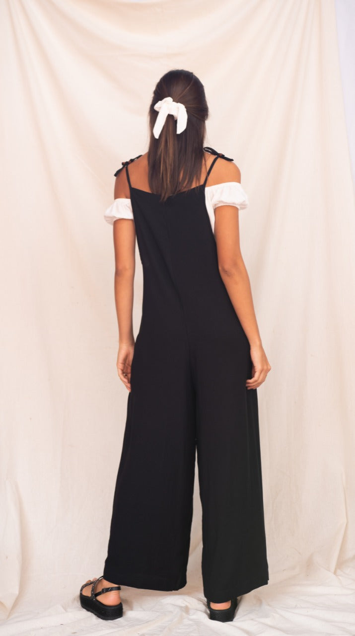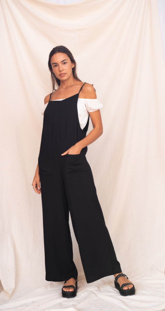 Jardineira Longa com bolsos frontais e alças de amarrar. Disponível nos tamanhos PP, P, M, G e GG.