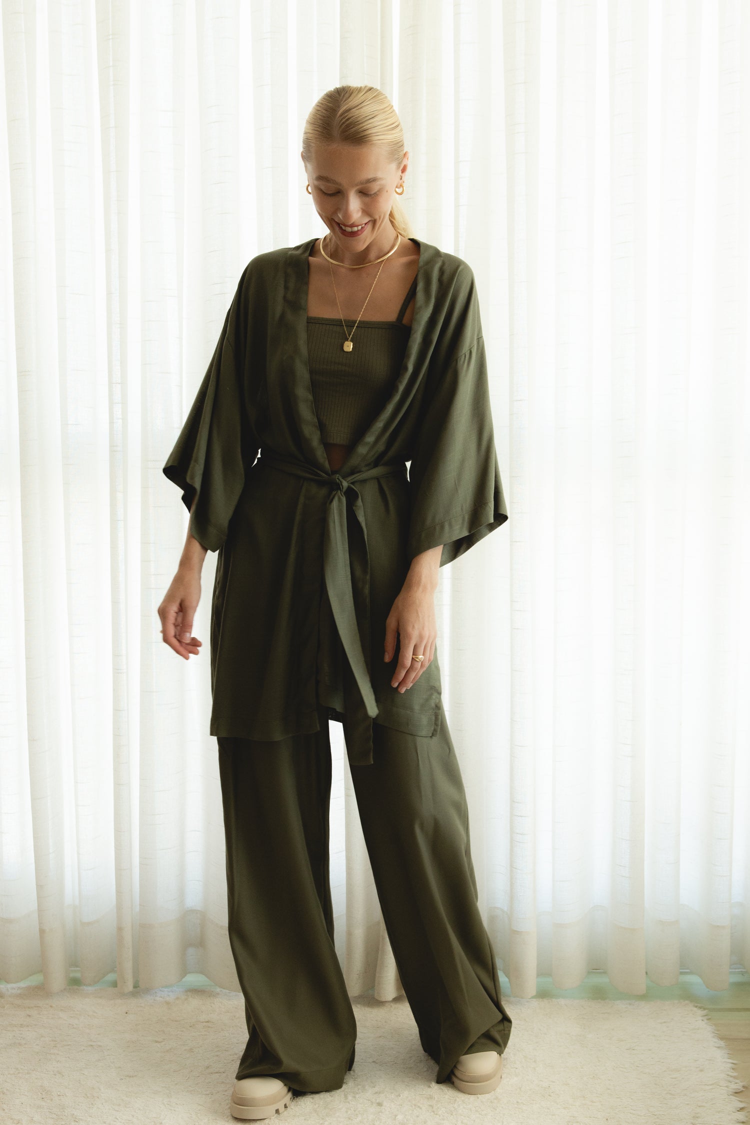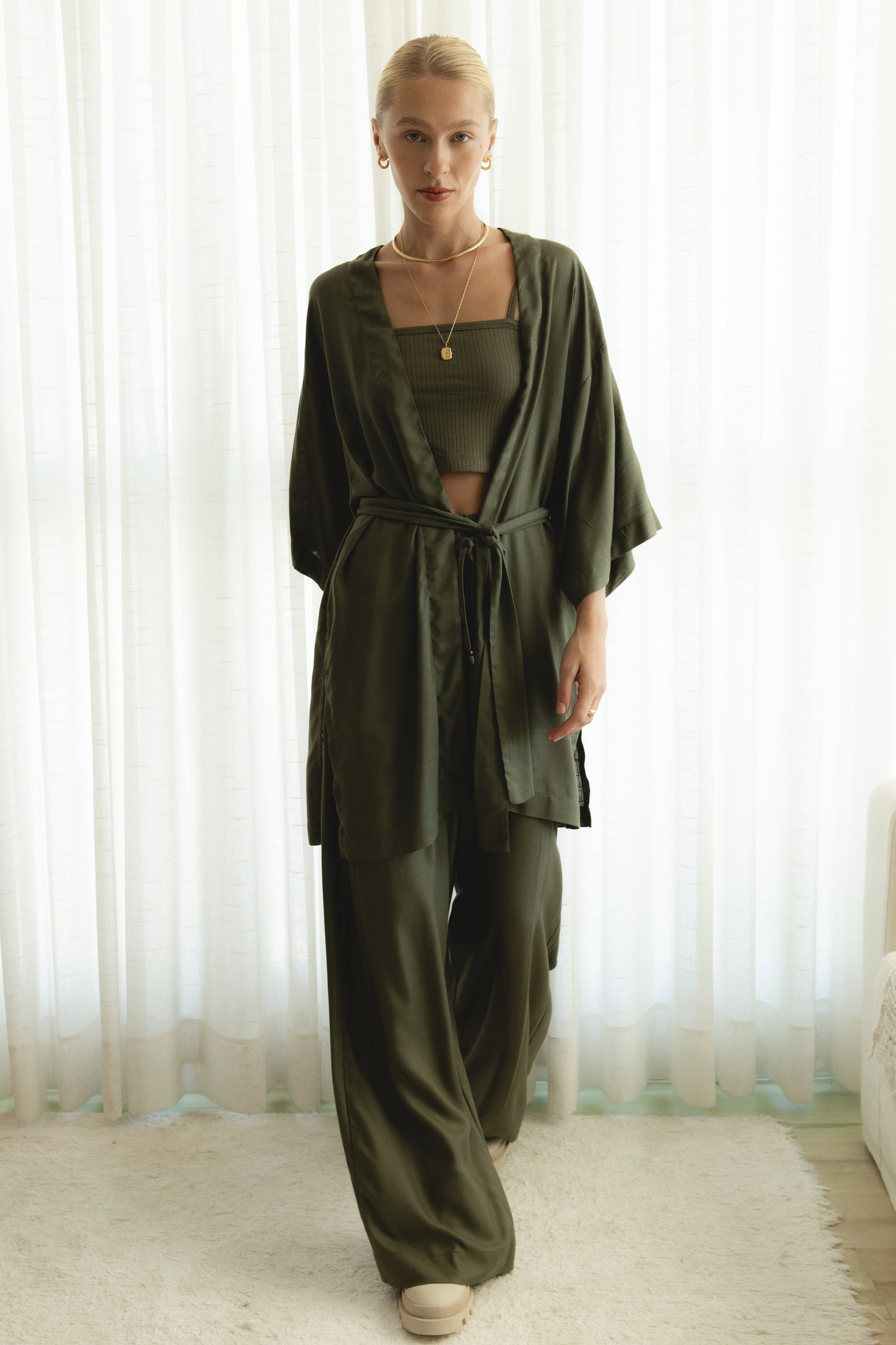 Confeccionado em viscose texturizada, o Kimono Reto Fenda tem modelagem soltinha e fendas laterais para maior fluidez ao movimento . Possui abertura frontal com pala acompanhando a abertura e mangas amplas. Vem com faixa para amarração na cintura e para usar a peças de diferentes formas.
