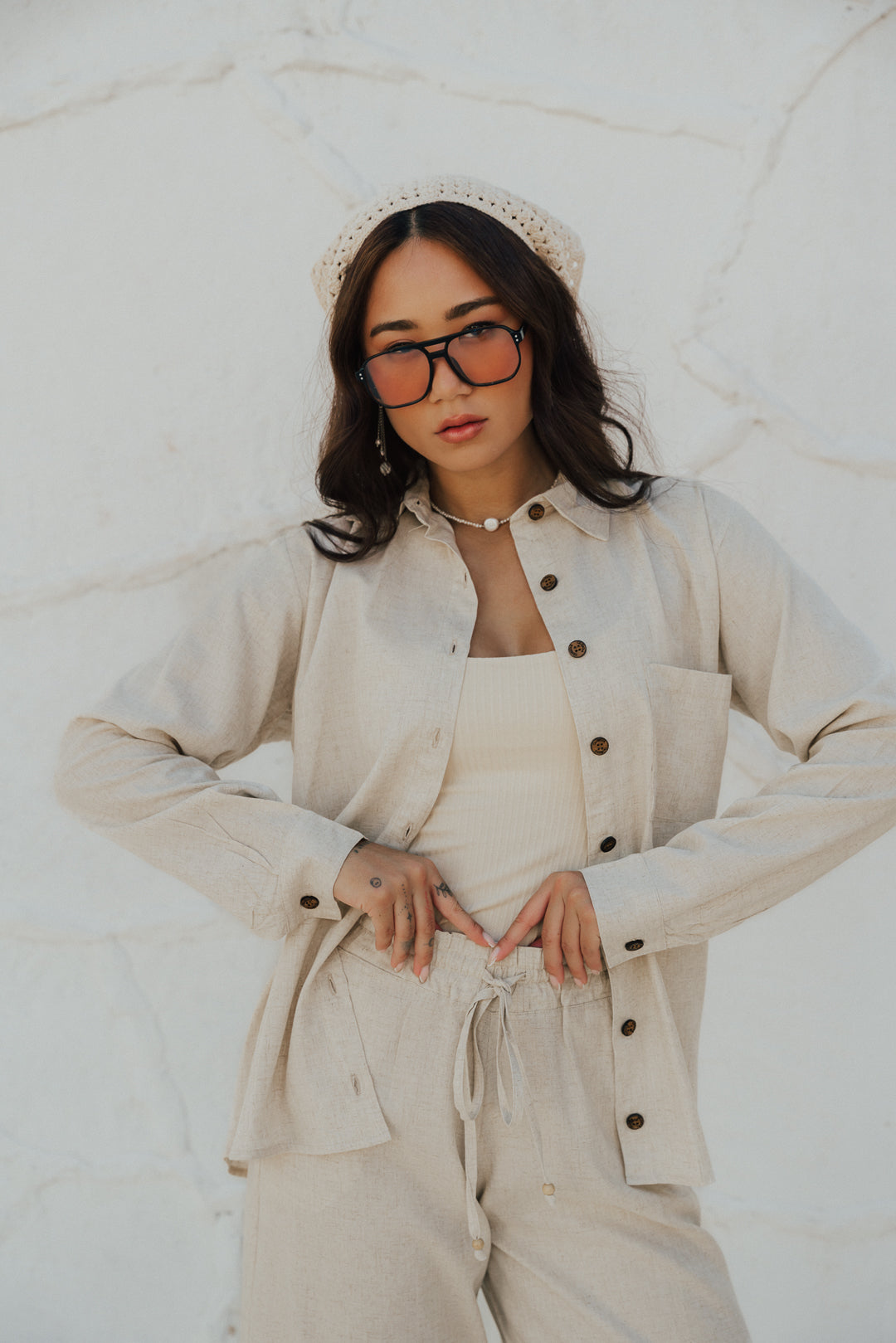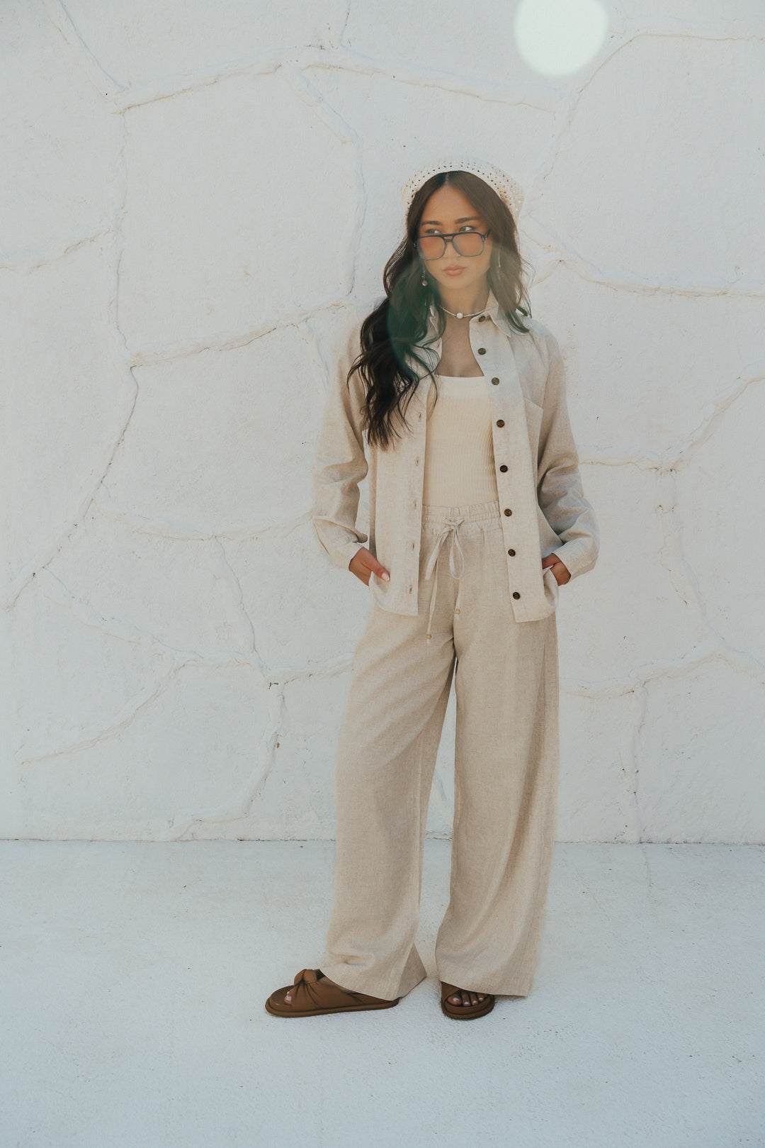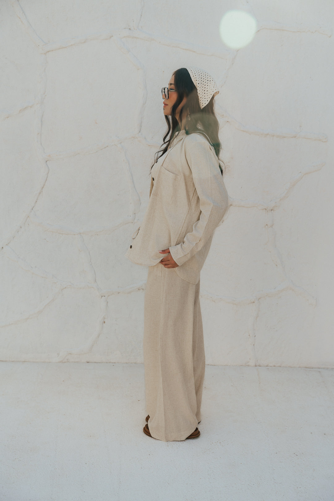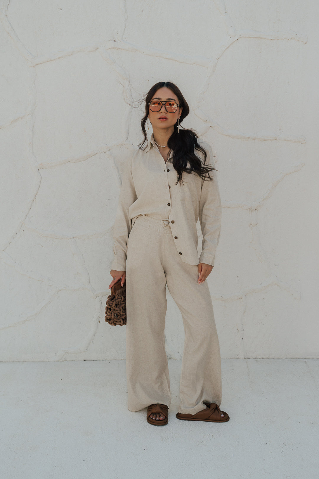 A Pantalona Laço Natural é confeccionada numa base mista de viscose e linho, sem tingimento. Com modelagem ampla e alongada, possui cós largo de elástico e cordão ajustável feito do próprio tecido, com acabamento em ponteira de madeira. Disponível nos tamanhos PP, P, M, G e GG.