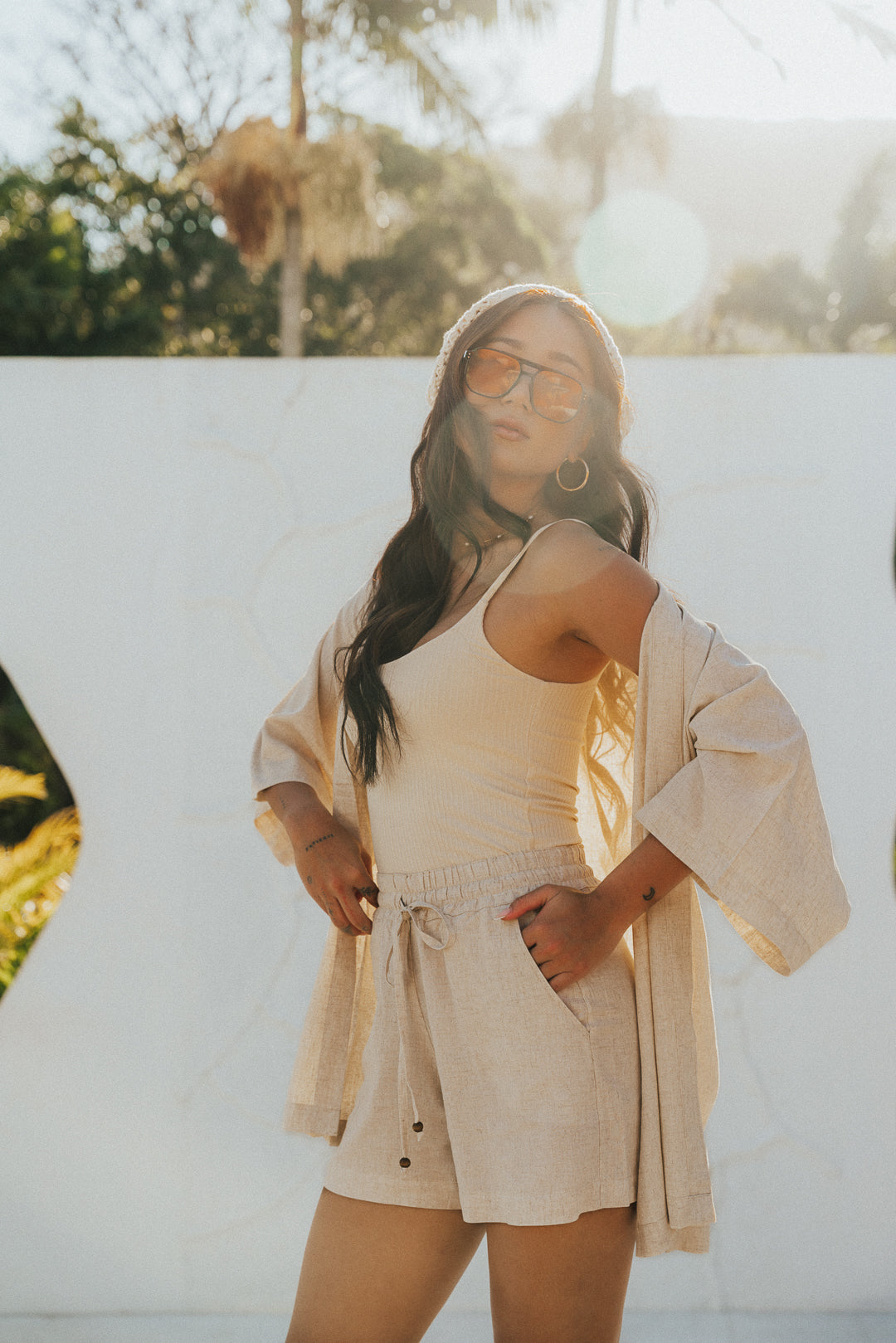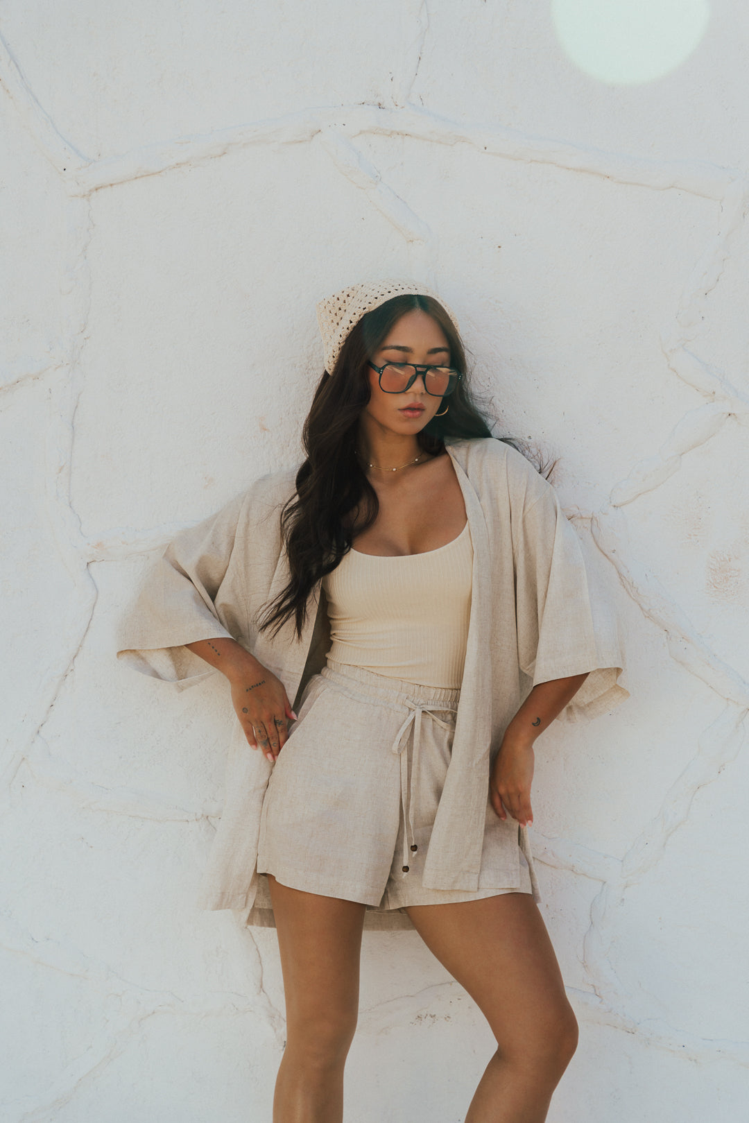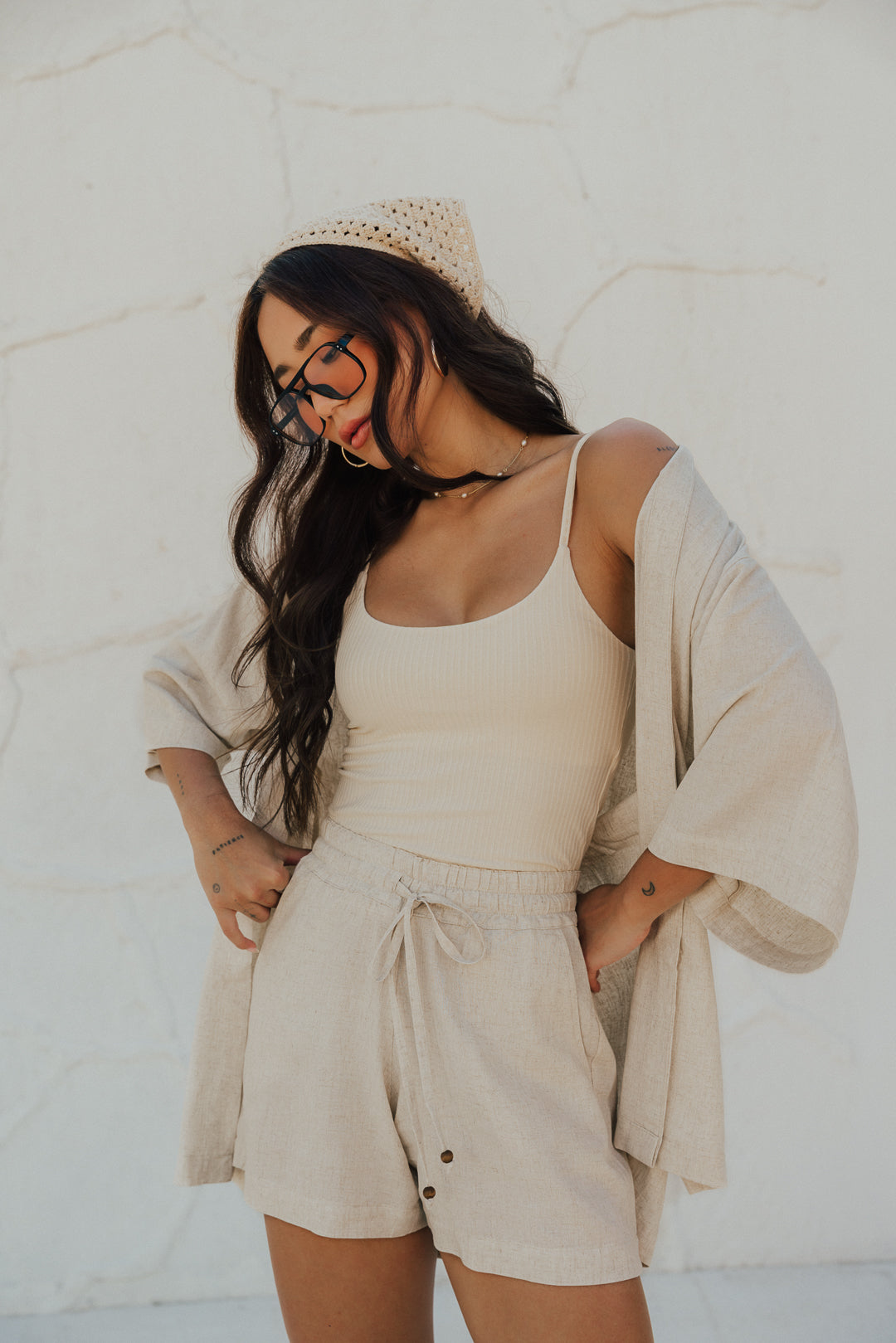 Short Laço possui cós largo de elástico frente e costas. Tem cordão de rolotê, do próprio tecido, para amarração e ajuste, finalizado com ponteiras de madeira. O modelo é soltinho e possui bolso faca.