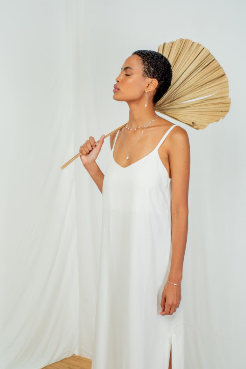 Vestido Longo, confeccionado em viscose. A peça possui modelagem clássica, decote arredondado, alças finas com regulador para ajuste e fendas laterais. Possui forro, do mesmo tecido, na região do busto.